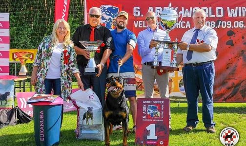 JOYCE IS ONE OF THE PRETTIEST FEMALES IN THE WORLD, WITH MANY INTERNATIONAL WINS ON BIG SPECIALTY SHOWS ALL OVER THE WORLD. JUST RECENTLY JOYCE TOOK 2ND PLACE AT THE 2018 IFR WORLD CHAMPIONSHIP IN ARGENTINA AND 2ND PLACE AT THE 2018 ADRK WORLD WINNER SHOW IN GERMANY. WON SIEGERIN (BEST ADULT FEMALE ON THE SHOW) MORE THAN 20 TIMES, FOR THE LIST OF HER ACCOMPLISMNETS PLEASE VISIT HER ALBUM ON OUR FACEBOOK PAGE. SHE IS ALSO EXCELLENT WORKING FEMALE, AND PRODUCED AMAZING OFFSPRING SO FAR.